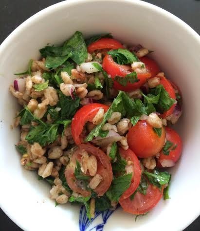 - In a bowl, combine garlic, parsley, mint, onion, tomatoes and olive oil